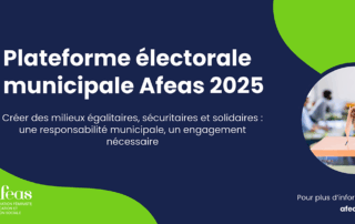À l’approche des élections municipales prévues le 2 novembre 2025, l’Association féministe d’éducation et d’action sociale (Afeas) lance un appel clair et déterminé aux candidat·e·s de toutes les municipalités du Québec : faire de l’égalité entre les genres, de la justice sociale et des droits des femmes des priorités[...]